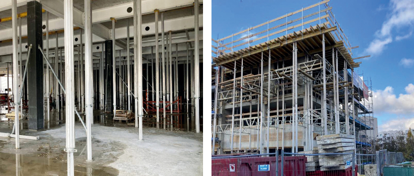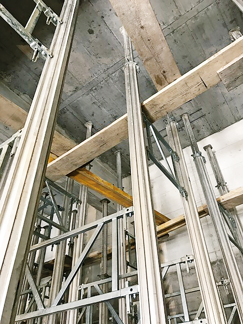 The heavy-duty props are connected with double-frames to form a shoring tower.